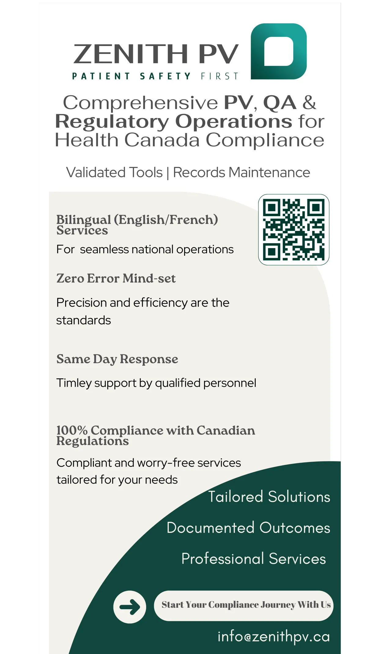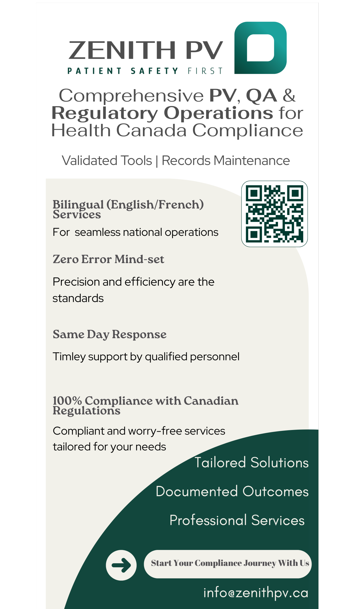Zenith is a bilingual Canadian company that helps life-science teams meet Health Canada requirements in pharmacovigilance, quality and regulatory affairs, using validated digital tools through an entirely qualified Canadian team.