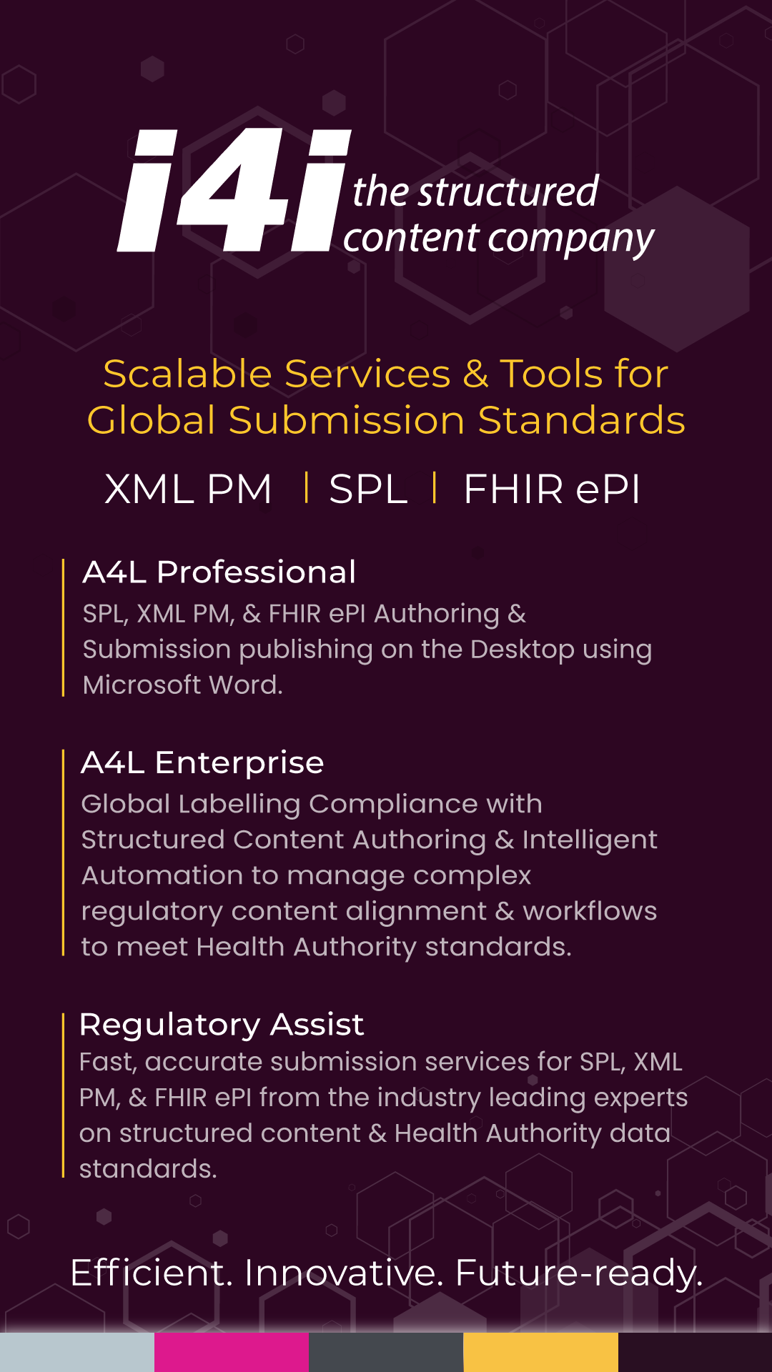 i4i is a recognized leader in services and technology for structuring regulated content to meet global regulatory labelling compliance and requirements, covering HL7 standards, SPL, XML PM, and FHIR ePI.