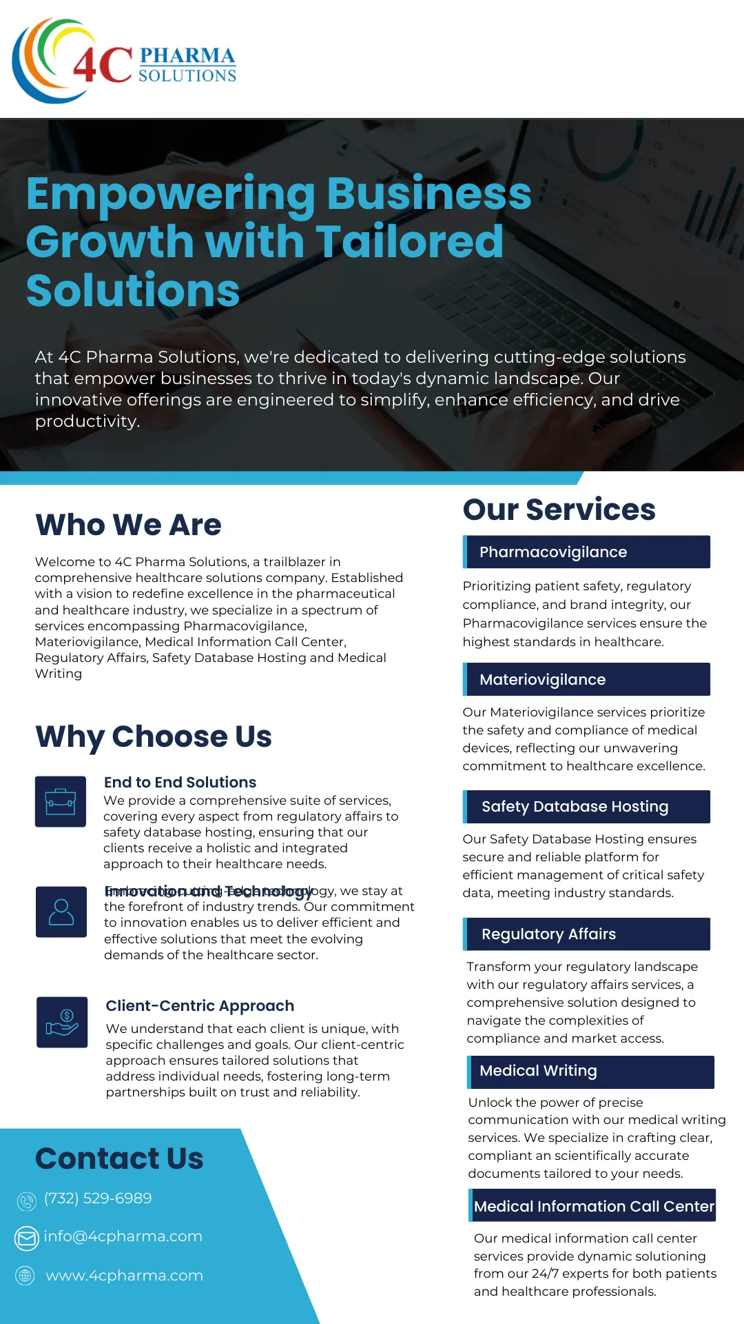 4C Pharma Solutions is a global healthcare solutions company established and operated by Physicians experienced in Clinical Research, and Pharmacovigilance. It is one of the fastest growing global service provider organizations headquartered in the United States. The service spectrum spans Pharmacovigilance/Safety, Cosmetovigilance, Materiovigilance, Regulatory Affairs, Medical Writing, Argus Hosting, CDM and Staff Augmentation for Drugs, Devices, Biologics, Consumer Care products, Nutraceuticals, Cosmetics, Veterinary & Cannabis products.