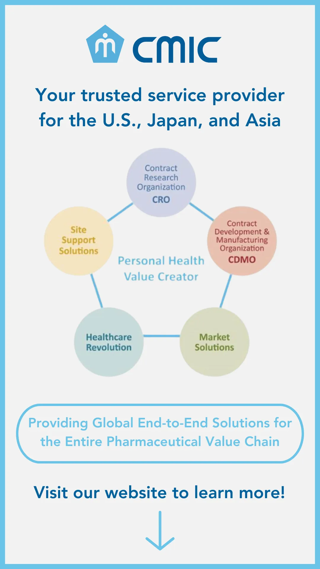 CMIC Group, founded as Japan's first CRO over 30 years ago, is now one of the largest clinical CROs in Japan with a global presence. Our services span non-clinical studies, clinical trial management, GMP manufacturing, regulatory consulting, healthcare and sales/marketing solutions. We facilitate market entry in Japan, offer clinical trial expertise in Asia, and bridge drug development between the US and Japan. With 7,000+ employees and 24 global sites, we're your comprehensive partner in the pharmaceutical, biotech, and medical device sectors.