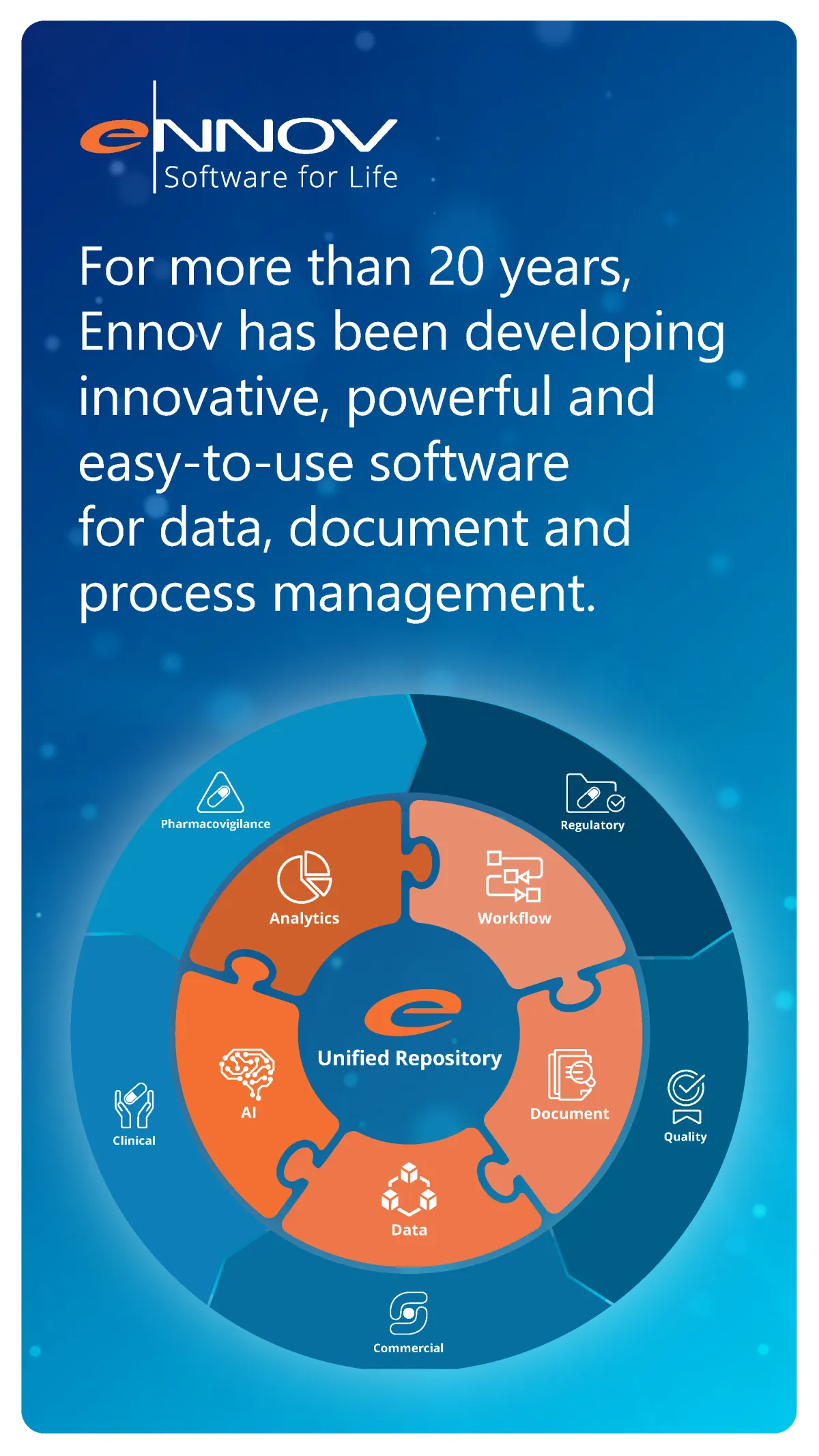 Ennov provides the most comprehensive, and cost-effective suite of software solutions for the Life Sciences industries. From leading pharmaceutical companies to emerging biotechs, we proudly serve over 300 companies and 250,000 users globally. For more than 25 years, we have been developing innovative and easy-to-use software for content, data and process management to support Clinical, Regulatory, Quality, Pharmacovigilance and Commercial operations.