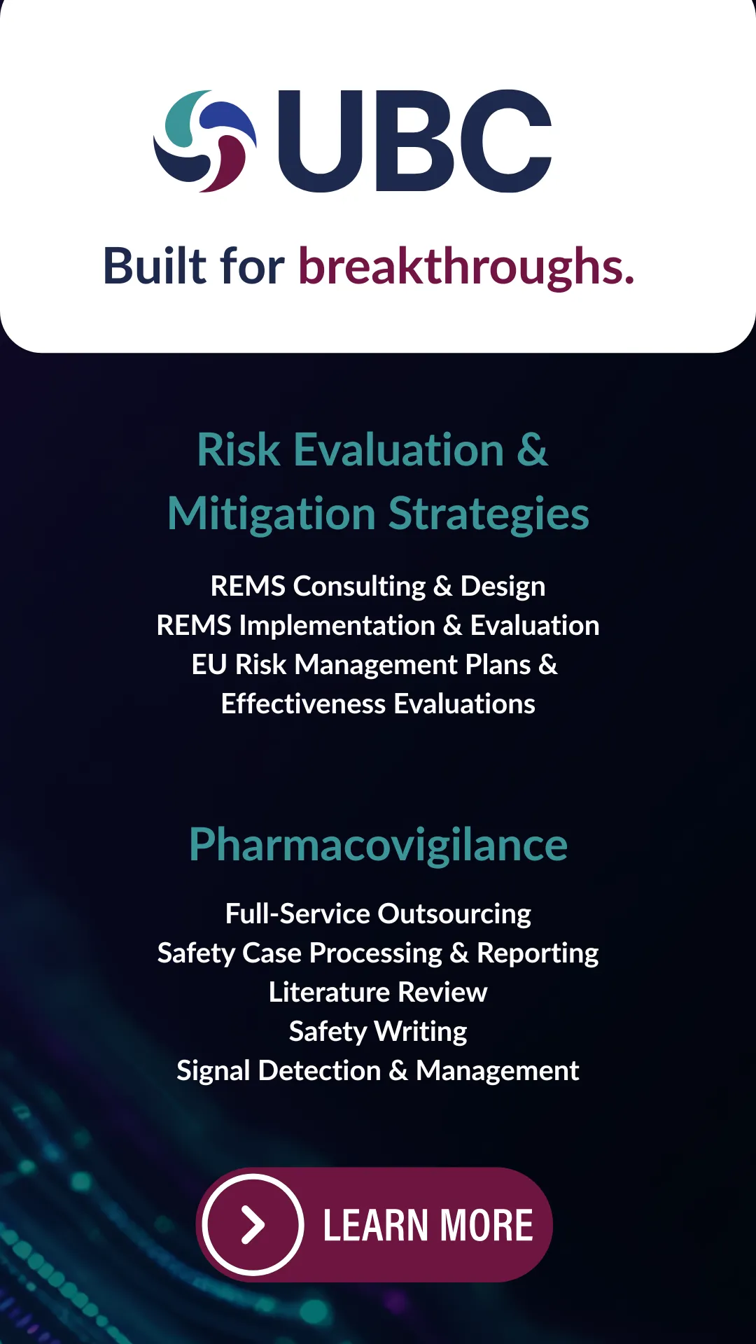 United BioSource LLC (UBC) is the leading provider of evidence development solutions with expertise in uniting evidence and access. UBC helps biopharma mitigate risk, address product hurdles, and demonstrate safety, efficacy, and value under real-world conditions. UBC leads the market in providing integrated, comprehensive clinical, safety, and commercialization services and is uniquely positioned to seamlessly integrate best-in-class services throughout the lifecycle of a product.