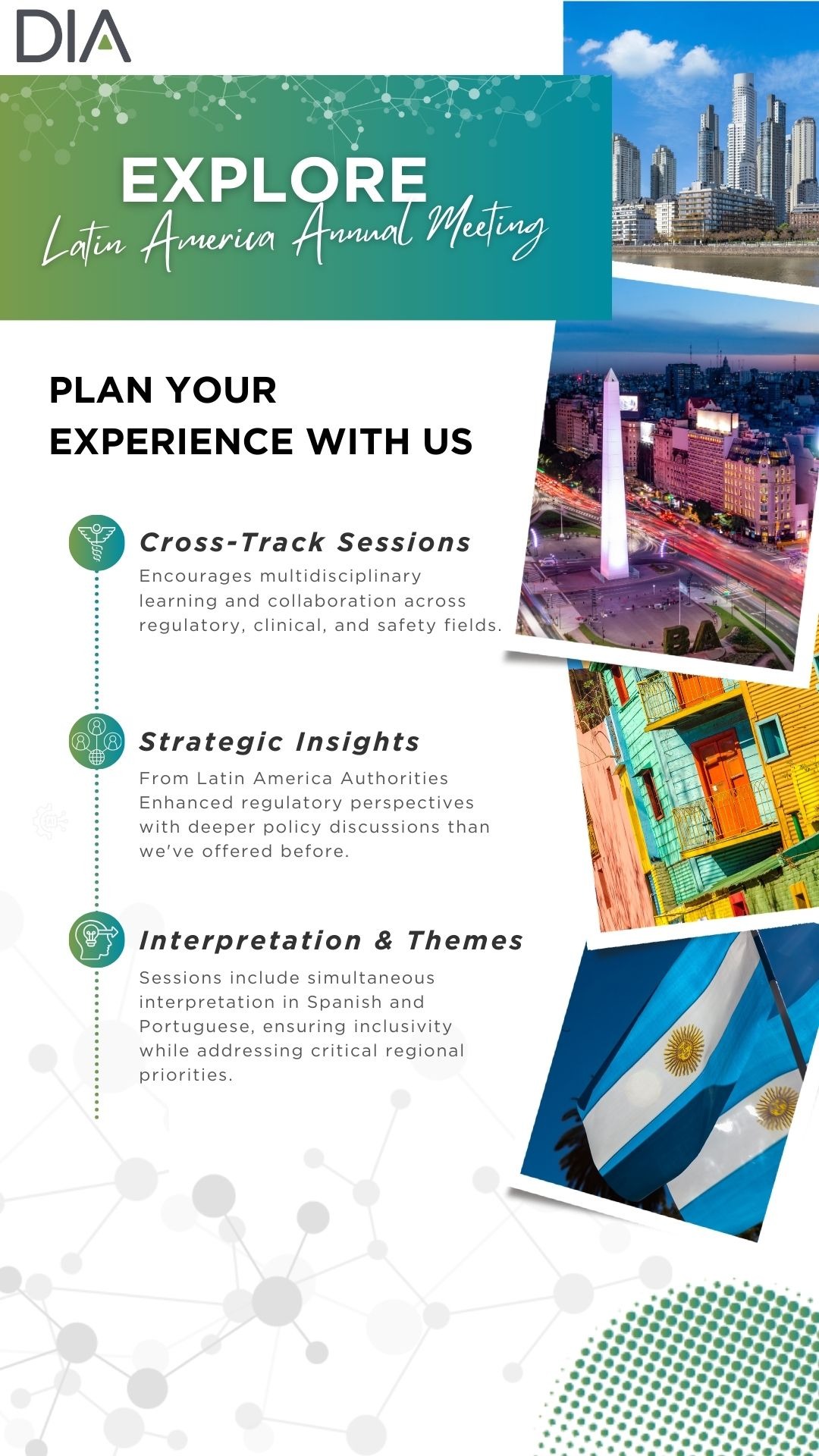 DIA’s 2025 Latin America Annual Meeting offers unparalleled opportunities for networking and knowledge sharing with key stakeholders to advance and implement life sciences R&D initiatives in Latin America and the Caribbean. This year, session tracks on Regulatory/Clinical and Safety and Pharmacovigilance expand the scope of the meeting, with cross-track sessions facilitating discussions on key connection points across these areas to promote collaboration and synergy within organizations.