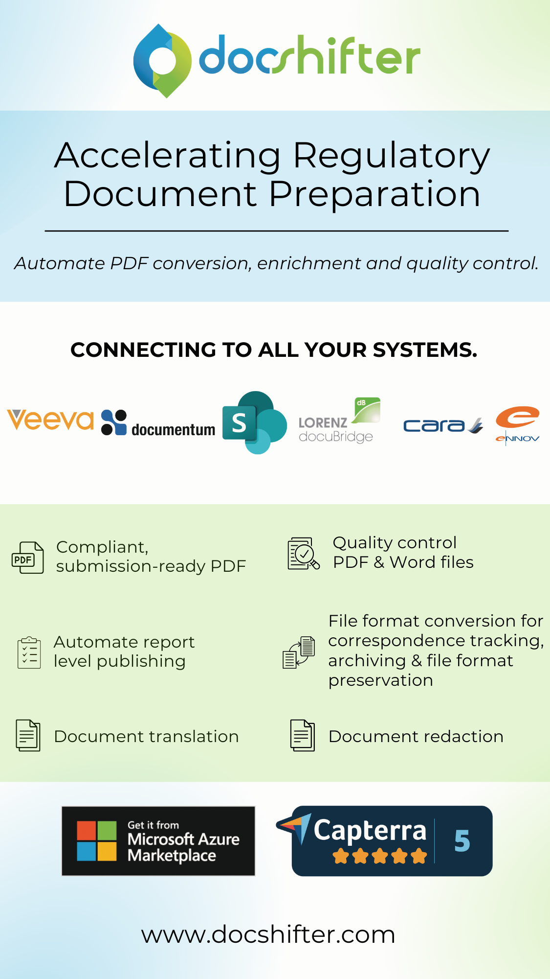 Automation, compliance, quality, speed, dynamic scalability, and configurability is why life sciences companies of all sizes choose DocShifter. We support the regulatory teams by: